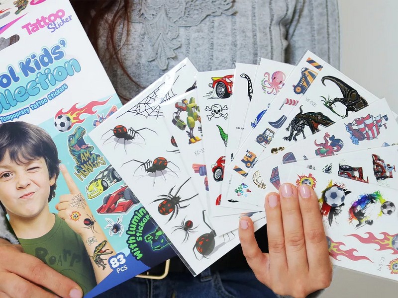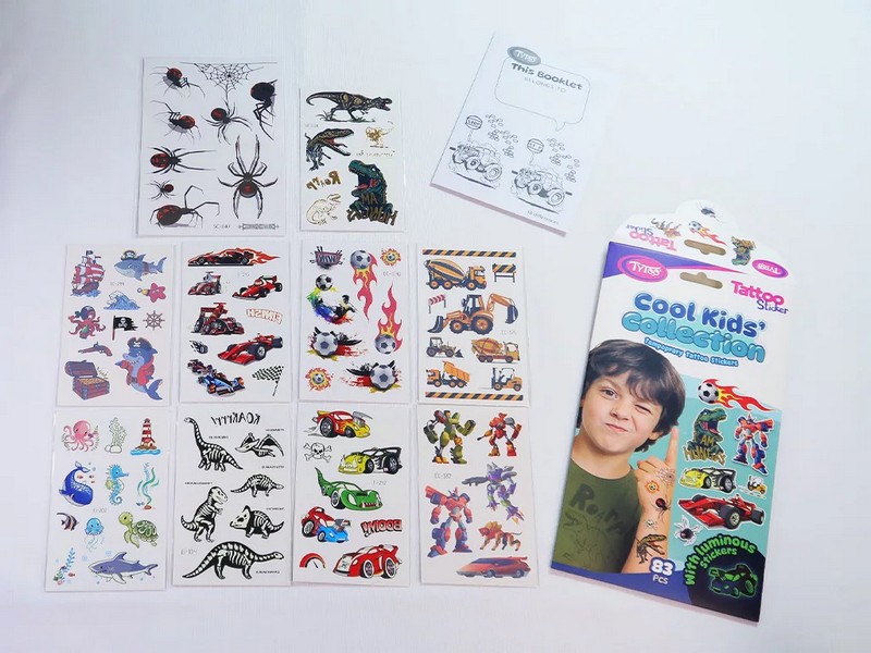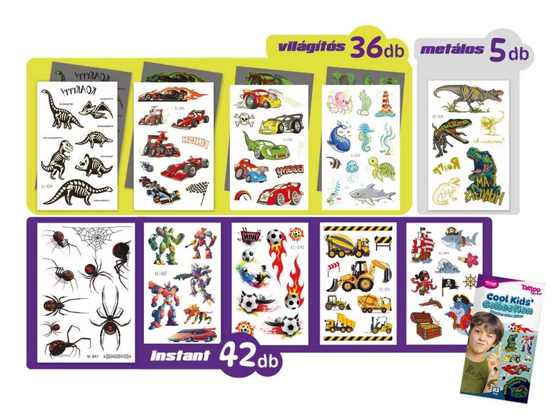 Minden, ami menő a fiúknak egy tetkószettben! Versenyautók, dinók, pókok, robotok, focilabdák és világítós szörnyek – ez a szett a legvagányabb gyerekeknek készült. Összesen 83 tetoválómatrica 3 különféle hatással (világítós, metálfényű és klasszikus), ráadásul egy meglepetés foglalkoztató füzetet is találsz benne! A csomag tartalma: Összesen 83 db tetoválómatrica, 3 különleges stílusban: Világítós tetkók: 36 db – versenyautók, szörnyek, tengeri lények sötétben is ragyognak! Metálfényű tetkók: 5 db – különleges, csillogó dinoszauruszok. Instant tetkók: 42 db – pókok, robotok, focilabdák, munkagépek, kalózok és még sok más izgalmas figura. Kedvencek, amik biztosan benne vannak: Lángoló focilabdák. Villámgyors versenyautók. Óriási dinók és sárkányok. Rémisztő, de vicces pókok és rovarok. Menő robotok és űrlények. Sárga markolók, daruk, teherautók. Kalózos és tengeri kalandminták. Meglepetés a csomagban: Egy kreatív foglalkoztató füzet, tele játékkal, színezővel, különbségkeresővel – a tetkózás után is garantált a szórakozás! Egyszerűen használható: csak egy kis víz kell hozzá. Könnyen eltávolítható. Tökéletes ajándék vagy meglepetés egy szülinapra, zsúrra, vagy egy unalmas délután feldobására!