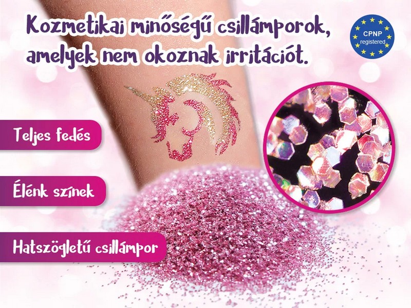Ez a csillámpor szett 12 gyönyörű, intenzív alapszínt tartalmaz, amelyekre biztos szükséged lesz egy csillámtetoválás festésénél. Lenyűgöző árnyalatok, amelyek minden mintát életre keltenek. Ha biztosra akarsz menni a klasszikus, élénk csillogásban, ez a szett a tökéletes választás! A 2,5ml-s tégelyes kiszerelés otthoni felhasználáshoz teljesen elegendő és tökéletes, 60-80 db mintát is kifesthetsz vele. A tégelyes csomagolás előnye, hogy könnyen hozzáférsz ecseteddel, és egyszerűen nyitható-zárható a kupakja. Az átlátszó külsőnek köszönhetően azonnal felismerhetőek a színek. Ezért használj kozmetikai csillámport. A kozmetikai csillámpor biztonságos, nem irritálja a bőrt, mivel nem tartalmaz káros anyagokat (Mindegyik csillámpor rendelkezik Biztonsági Értékeléssel, ami ezt bizonyítja). Az apró szemcsék 6 szögletűek, ezért jól illeszkednek egymáshoz a festés során és így lesz szép, hosszantartó a csillámtetoválás. A legerősebb nyári napfényben is élénk színű marad, így gyermeked sokáig élvezheti a csillogó tetkóját.