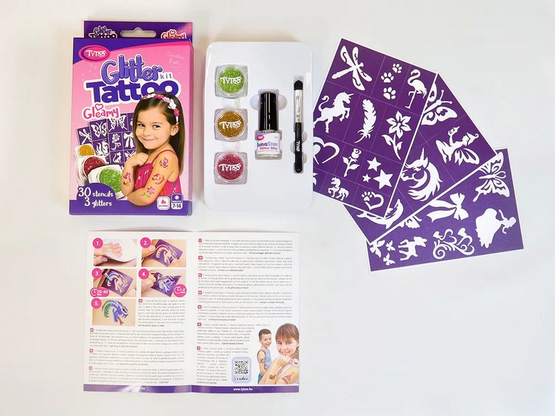 A Gleamy Csillámtetoválás Szett az egyik legnépszerűbb választás a 3–12 éves kislányok körében, hiszen minden benne van, ami a varázslatos csillogáshoz kell: tündérek, pillangók, ragyogó színek és kreatív élmények. Ez a készlet tökéletes ajándék születésnapra, névnapra, ünnepekre vagy akár egy különleges hétvégi programhoz. A csillámtetoválás nemcsak látványos, hanem igazi alkotó élmény is, amely fejleszti a kézügyességet és a kreativitást mindezt játékos, biztonságos formában. Mit tartalmaz a Gleamy csillámtetoválás készlet? 30 db sablon – részletgazdag pillangó és tündér mintákkal, 1 db LunaStar ragasztó (5 ml) – bőrbarát, kozmetikai minőség, 3 db kozmetikai minőségű csillámpor – élénk, ragyogó színekben, 1 db ecset – a precíz felvitelhez, 1 db részletes használati útmutató. A készlet teljes körű megoldást kínál: nem szükséges külön eszközöket vásárolni, minden megtalálható benne az azonnali alkotáshoz.