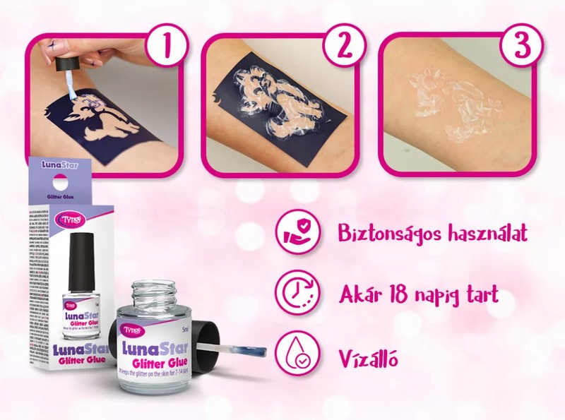 Csillámtetoválás készítéséhez használható, minőségi csillámpor ragasztó. A TyToo Csillámpor ragasztó a csillámport 7-17 napig tartja a bőrön. A testdíszítéshez szükséged van egy erős, tartós és mindenképp biztonságos ragasztóra, amit a gyerekekre is nyugodt szívvel kenhetsz. Ilyen a TyToo Fehér 5ml ragasztó is ami 50 db átlagos méretű mintára elegendő. Ahhoz, hogy kényelmesen tudj alkotni az üvegcse kialakítása hasonlít a körömlakkos üvegekhez, így komfortosan foghatod a kezedben. Az 5 ml-s TyToo csillámpor ragasztó 50db átlagos méretű mintára elegendő. A ragasztók kis üvegekben vannak, aminek tökéletes ecsetmérete van a mintasablonok lefestéséhez. Ha sűrűnek találod a ragasztót, vagy használat alatt elpárolog belőle a víz és besűrűsödik, nyugodtan hígíthatsz rajta vízzel. Mivel a ragasztók vizes bázisúak a ragasztós üvegbe 1-2 csepp vizet kell cseppenteni és ezzel felhígíthatod az eredeti állapotra. Vigyázz, hogy túl ne hígítsd, nem kell hozzá sok víz! Fontos! A csillám ragasztó kifejezetten csillámtetoválások elkészítéséhez lett kifejlesztve. Az aprólékos vékony mintákhoz és a nagy minták festéséhez is használhatod. Olajok oldják, ezért kerüld az olajok használatát a csillámtetoválásodon. Viszont, ha el szeretnéd távolítani a festést, olajos kendővel tudod lemosni. Kiváló minőségének köszönhetően víz-és izzadságálló, akár 7-17 napig is megmarad a csillámtetoválás a bőrön. 1-3 perc után átlátszóvá válik, ezután elég időd lesz a minta elkészítésére, hiszen nem szárad olyan hamar. Testdíszítő kövek rögzítéséhez is használhatod. A vékony részleteknél is jól tartja a csillámport, mert a ragasztó ott is ugyanolyan telt lesz, mint a minta nagyobb részein. Szabad kézzel való rajzoláshoz kitűnő (használj hozzá vékonyabb ecsetet). Tipp: A ragasztóba körömdíszítő, vagy testdíszítő köveket is belenyomhatsz, ezeket is szépen fel tudod ragasztani a csillámragasztóval a bőrre. Ha kövekkel is kiegészíted a csillámtetoválást, még látványosabb mintát készíthetsz.