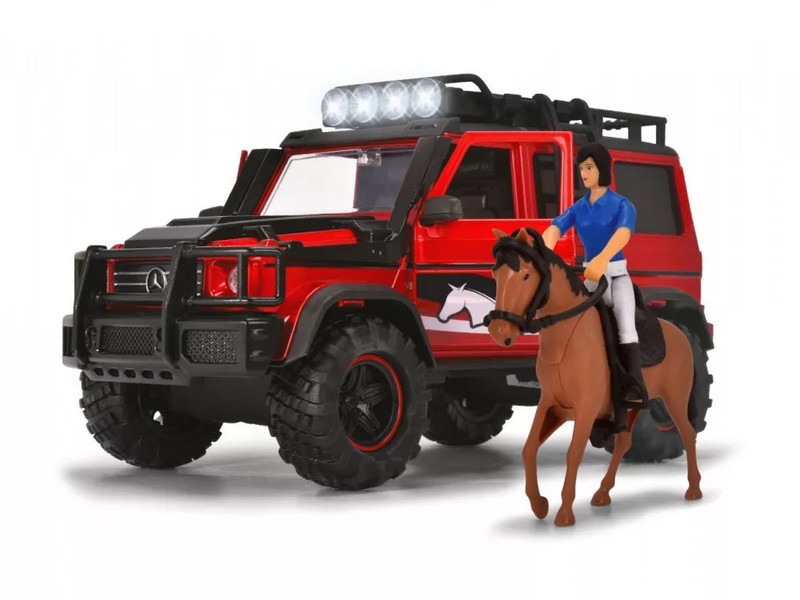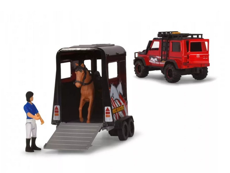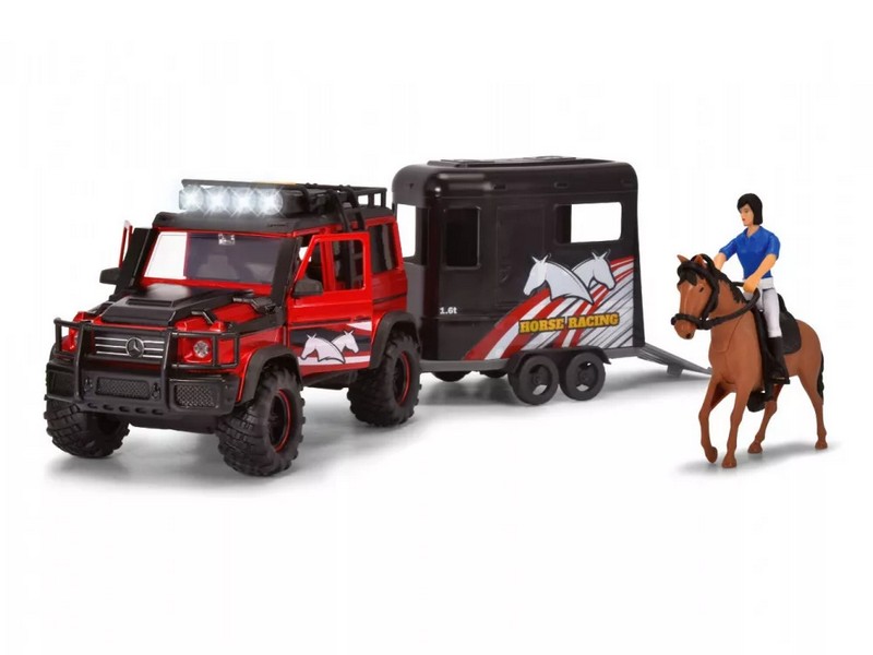 Dickie lószállító autó fénnyel és hanggal 42 cm Dickie terepjáró kiegészítőkkel. Ezzel a menő terepjáróval te leszel a legmenőbb, mikor megjelensz a lóversenyen! A játékszett minden szükséges elemet tartalmaz egy szórakoztató szerepjátékhoz, melynek csak a fantáziád szabhat határt. A lószállító jármű és utánfutója mellett egy ló és lovas figura is található a készletben. A mozgó alkatrészek mellett fény- és hanghatások teszik még izgalmasabbá a játékélményt a kisfiúk számára. A lovaglás és az autózás kedvelői most egyszerre kaphatnak meg mindent, amire vágynak. A jármű és vontatmánya kb. 42 cm hosszú. A csomagolás a szükséges elemeket tartalmazza.