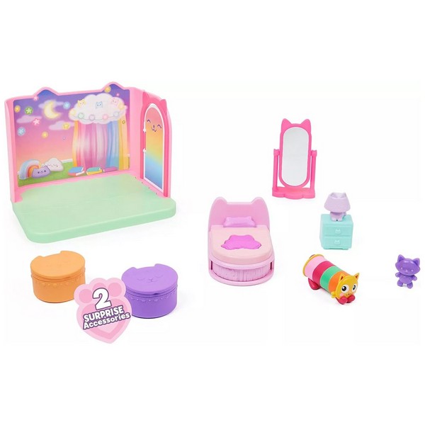 Cuki cicák, furfangos játékok és színpompás varázslat! Tarts a macskarajongó Gabival és hű pajtásával, Pandival és légy részese az izgalmas kalandoknak. A népszerű Netflix sorozat, a Gabi babaháza Deluxe szobaszettjei lehetőséget teremtenek a kis rajongóknak, hogy belelessenek az imádnivaló cicusok mindennapjaiba. Ebben a játékszettben Pillow Cat hálószobájával bővülhet a kicsik gyűjteménye. A készletben minden megtalálható, amire egy álomszuszék cirmosnak szüksége lehet: egy kényelmes ágyikó, éjjeliszekrény és lámpa, egy tükör és egy alvós játék is. A Pillow Cat figura és a kiegészítők jó minőségű műanyagból készültek, így a gyerekek sokáig élvezhetik a szettel való játékot. A kis dobozok egyikében található QR-kód beszkennelésével, valamint az ingyenes Gabi babaháza alkalmazás letöltésével különleges jutalmat kaphatnak a gyerekek. A játékszett lehetőséget teremt, hogy a gyerekek újrajátsszák az animációs sorozat jeleneteit, de akár újakat is kitalálhatnak, amely során fejlődik képzeletük, fantáziájuk, és kommunikációs készégük. A színek és díszítések eltérhetnek a képen láthatótól. Csomagolás mérete: kb. 26 x 9 x 20 cm.