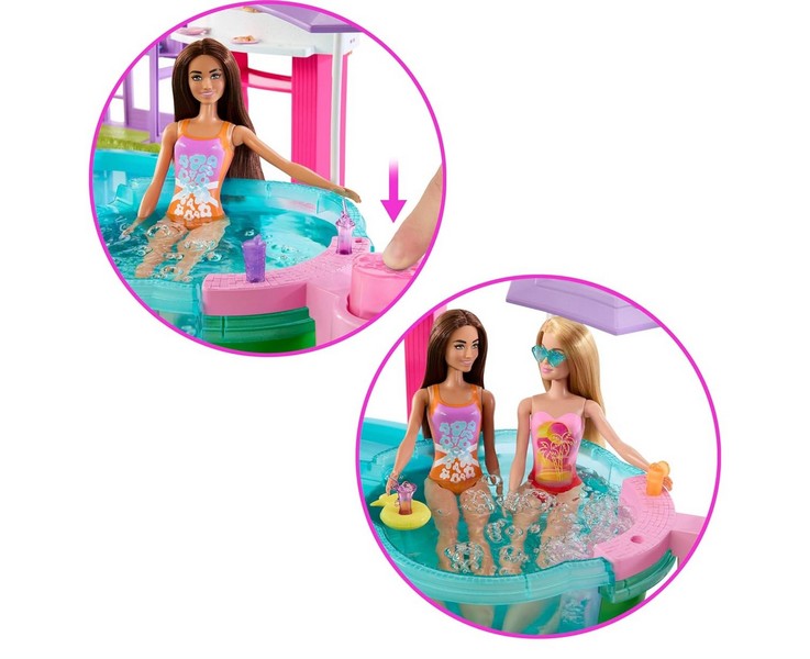 Ha van egy medencéd, minden nap buli lehet és ezt Barbie is jól tudja, aki imád belecsobbanni az élményekbe! Ezzel a játékszettel a gyerekek elmerülhetnek a nyári kalandokban. Ha csúszdázni, pezsgőfürdőzni, napozni támad kedvük, vagy csak szeretnének egy frissítőt inni a hűvös vízben - a külön kapható - Barbie-val itt ezt megtehetik. A több játéktérrel és a húsznál is több kiegészítővel mókás kalandok játszhatók. A gyerekek láthatják Barbie milyen nagyokat pancsol, ha megtöltik a medencét és lecsúsztatják a vízbe, vagy a jakuzzi gombját nyomkodva pezsgőfürdőt készíthetnek kedvencüknek. A készlet babát nem tartalmaz. Szuper ajándék lehet 3 évesnél idősebb gyerekeknek. A színek és díszítések eltérhetnek.