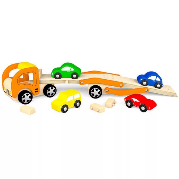 A minőségi fából készült autószállító kamion, nyerges vontatóval és négy darab színes kisautóval, ideális játék a mozgékony és kíváncsi kisgyermekek számára. A kamion és pótkocsija részletgazdagon kidolgozott, a valós járművek funkcionalitását utánozva. A leszerelhető, két emeletes pótkocsi lehetővé teszi, hogy a gyerekek a való életben is tapasztalható tevékenységeket játsszák el, miközben a felső szint mozgatható kialakítása révén a kisautók könnyedén le tudnak gurulni a hosszú pályán. A fajátékok nemcsak szórakoztatóak, hanem hatékonyan támogatják a gyermek kognitív, motorikus és problémamegoldó képességeinek fejlődését. Az egyszerű, mégis ösztönző kialakításnak köszönhetően ideális eszköz az óvodás és kisiskolás korosztály számára. A természetes fából készült készségfejlesztő játékok környezetbarát megoldást kínálnak a szórakozásra, miközben fejlesztik a gyermek kézügyességét, koncentrációját és logikai gondolkodását. Tartós, biztonságos és időtálló választás minden korosztály számára. Mérete: 35 X 25,5 X 28 cm.