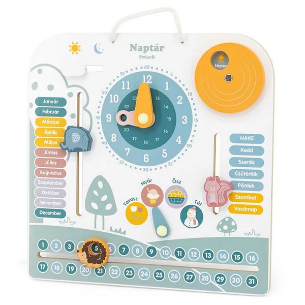 A magyar nyelvű fanaptár nem csupán egy fajáték, hanem egy minőségi oktatási eszköz, amely kifejezetten arra lett tervezve, hogy a gyerekek számára szemléletes és interaktív módon mutassa be az idő fogalmát, az évszakokat, hónapokat, napokat, napszakokat, az időjárás változásait és az óra működését. Ez a fa oktatási eszköz kitűnően hasznosítható csoportos oktatási környezetben, mint az óvoda vagy az iskola, de otthoni egyéni fejlesztésre is ideális választás. A fajátékok nemcsak szórakoztatóak, hanem hatékonyan támogatják a gyermek kognitív, motorikus és problémamegoldó képességeinek fejlődését. Az egyszerű, mégis ösztönző kialakításnak köszönhetően ideális eszköz az óvodás és kisiskolás korosztály számára. A természetes fából készült készségfejlesztő játékok környezetbarát megoldást kínálnak a szórakozásra, miközben fejlesztik a gyermek kézügyességét, koncentrációját és logikai gondolkodását. Tartós, biztonságos és időtálló választás minden korosztály számára. Mérete: 29,5 X 29,5 X 3 cm