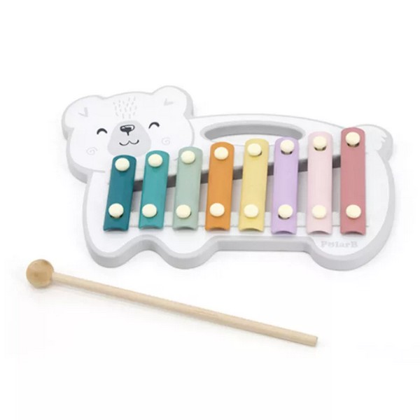 Fából készült jegesmaci formájú játék metalofon 8 darab színes fémlappal. Lehetőséget nyújt a zenélésre már olyan gyermekek számára is, akik még csak most ismerkednek a hangszerekkel. Egyszerű a használata, ezért a gyerekek szinte azonnal ráéreznek a zenélés ezen módjára. Kiválóan fejleszti a ritmusérzéket, a hallást és a kreativitást. A játékhangszer nem hangolt. A fajátékok nemcsak szórakoztatóak, hanem hatékonyan támogatják a gyermek kognitív, motorikus és problémamegoldó képességeinek fejlődését. Az egyszerű, mégis ösztönző kialakításnak köszönhetően ideális eszköz az óvodás és kisiskolás korosztály számára. A természetes fából készült készségfejlesztő játékok környezetbarát megoldást kínálnak a szórakozásra, miközben fejlesztik a gyermek kézügyességét, koncentrációját és logikai gondolkodását. Tartós, biztonságos és időtálló választás minden korosztály számára. Mérete: 22,5 X 17,5 X 3,2 cm
