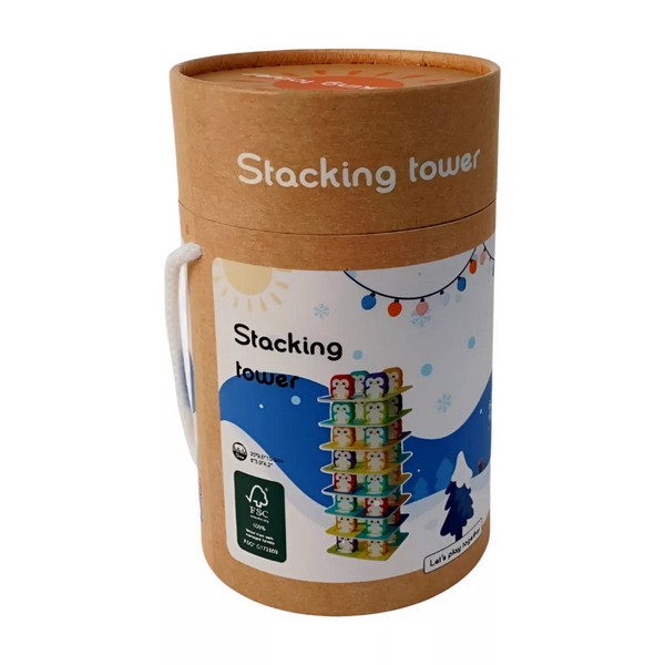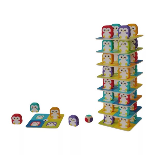 A leboruló pingvines torony a jenga játék egy különleges változata, mely stratégiai és taktikai, koordinációs készség fejlesztését, a beszédkészség javítását, matematikai alapismeretek bővítését segíti. A játék menete: A pingvineket 4-esével felhelyezzük a számozott lapokra (növekvő sorrendben 1-9-ig) toronyszerűen. Amikor a torony elkészült a színdobókocka segítségével a játékosok dobnak és egy a színnek megfelelő pingvint kell elvegyenek valamelyik falapról úgy, hogy a torony ne boruljon le. Akinek ez nem sikerül, az lesz a játék vesztese a többiek a győztesek. Egyéni és társas foglalkozásra egyaránt kiváló játék. A fajátékok nemcsak szórakoztatóak, hanem hatékonyan támogatják a gyermek kognitív, motorikus és problémamegoldó képességeinek fejlődését. Az egyszerű, mégis ösztönző kialakításnak köszönhetően ideális eszköz az óvodás és kisiskolás korosztály számára. A természetes fából készült készségfejlesztő játékok környezetbarát megoldást kínálnak a szórakozásra, miközben fejlesztik a gyermek kézügyességét, koncentrációját és logikai gondolkodását. Tartós, biztonságos és időtálló választás minden korosztály számára. Mérete: 10 x 10 x 32 cm