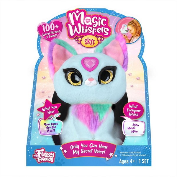 A My Fuzzy Friends suttogó plüss cicákkal titkos csevejt folytathatsz, kérdéseket tehetsz fel nekik, és még vicces rejtvényekkel is szórakoztatnak. Szorítsd a homlokodhoz a cicus kristályszívét, hogy meghallgasd, mit suttog csak Neked. Skye szereti, ha a bal fült simogatják - ezzel 3 mód között válthatsz. Hallgasd meg a titkot, amit meg szeretne osztani veled, vagy tégy fel neki egy eldöntendő kérdést, amire igennel vagy nemmel válaszol. A harmadik képessége, hogy feladvánnyal szórakoztat – ilyenkor hajolj közel, hogy meghallgasd a megfejtést. A magyarul beszélő interaktív My Fuzzy Friends Magic Whispers suttogó cicákat 4 éves kortól ajánljuk.