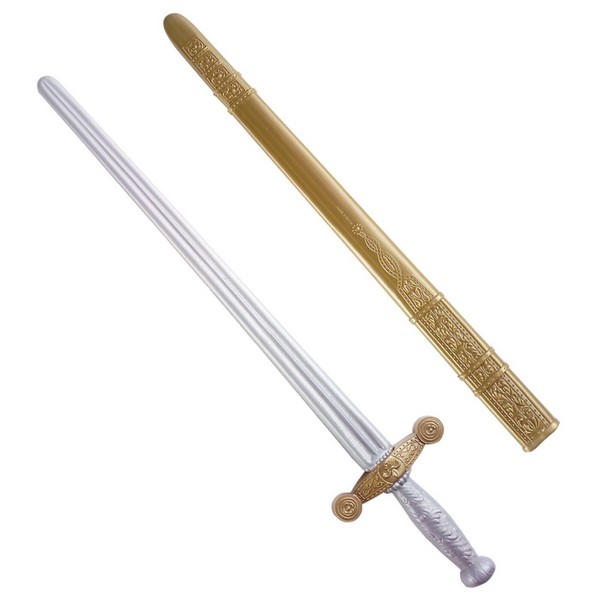 Antik hatású ezüst színű műanyag kard díszes markolattal, arany színű tokkal. Mérete: 75 cm. 3-8 éves korig