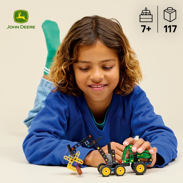 Hívd erdei kalandokra a 7 éves vagy nagyobb gyerekeket, fiúkat és lányokat a LEGO® Technic John Deere 1470H kerekes betakarítógéppel (42218)! Ez az építőipari jármű rengeteg funkcióval van ellátva, hogy örömet szerezzen a fiatal John Deere rajongóknak. Nézd meg a 180 fokban elforgatható gémet! Utána pedig jöhetnek az izgalmas kalandok, hiszen a gyerekek kinyitják és bezárják a markolót, hogy megfogják, felemeljék és leengedjék a rönköt. Ezen a STEM-játékon billenőkaros felfüggesztés és csuklós kormányzás is található, amiket a gyerekek működtethetnek. A szemet gyönyörködtető zöld, fekete és sárga, John Deere-re jellemző színösszeállítással ez a készlet annyira szórakoztató, hogy a gyerekek újra és újra előveszik, hogy játsszanak vele. A LEGO Technic készletek elemei valósághű mozgásokkal és szerkezetekkel vannak ellátva, amelyek megközelíthető és realisztikus módon vezetik be a fiatal LEGO építőket a műszaki tudomány világába. A LEGO Builder appal a gyerekek magabiztosan építhetnek, hiszen itt 3D-ben felnagyíthatják és megforgathatják a modelleket, és követhetik a haladásukat a könnyen átlátható digitális útmutatókkal. A szett 117 elemből áll.
