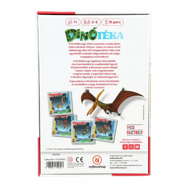Te vagy a dinók legnagyobb ismerője? Most bizonyíthatod tudásodat a Dinótéka segítségével. Hívd ki a többi játékost, párbajozzanak a dinóitok a tulajdonságaik alapján, ha nagyon biztos vagy magadban, akkor emeld a tétet, és gyűjtsd Te a legtöbb kártyát a játék végére. Képzeld el, hogy rábukkantok egy különleges, csúcstechnológiás eszközre, amellyel beleláthattok a történelem előtti időkbe! A Dinótéka nem csupán egy társasjáték, hanem egy izgalmas időutazás, ahol a játékosok célja, hogy minél több információt gyűjtsenek össze a valaha élt leghatalmasabb lényekről. Ebben a pörgős és látványos játékban te lehetsz a legügyesebb felfedező, aki feltárja a dinoszauruszok rejtélyes világát! A játék célja, hogy a kártyák kijátszásával és kihívások megnyerésével te gyűjtsd össze a legtöbb DinóBit kártyát. Minden kártya előlapján egy dinoszaurusz képe látható, a hátoldalán pedig négy különböző színű sáv jelzi az állat jellemzőit: a kék a magasságot, a zöld a hosszat, a sárga a súlyt, a piros pedig az életkort mutatja. A játékmenet izgalmas versenyfutás az adatokért, az úgynevezett DinóBitekért. Minden körben te döntöd el, melyik irányba tereled a kutatást: a te Brachiosaurusod a legmagasabb a mezőnyben, vagy talán a legkisebb súlyú versenyzőt keresed? Meg kell ismerned az állatok titkos adatait, hogy a megfelelő pillanatban csaphass le a győzelemre. A Dínótéka egy kiváló társasjáték, 2 - 5 játékos részére, az átlagos játékidő rövid, csak 15 perc. A társas elsősorban gyerekeknek készült, akár már 7 éves kortól is játszható. A játékmenet erősen épít a pakli tervezés mechanizmusra.