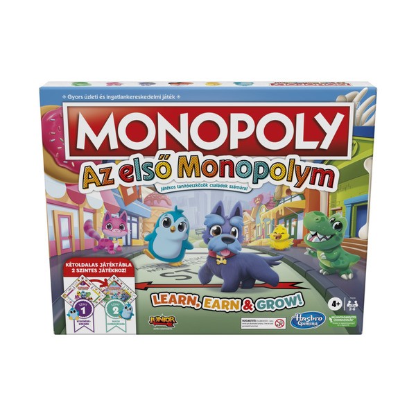 Ebben a kezdőknek készült Monopoly társasjátékban egy kétoldalú tábla és kétféle játékmód várja a játékosokat. Az egyszerű játékmenetnek, édes figuráknak és a gyerekbarát helyszíneknek köszönhetően ez a társasjáték ideális bevezető a Monopoly játékok világába. Kétoldalú játéktábla: A gyerekekkel együtt fejlődő játék! Az egyik oldal kisebb gyerekek számára készült (4 éves kortól). A másik oldala nagyobb, már a 6–7 éves gyerekeknek is kihívást jelenthet. A doboz 2 kártyapaklit tartalmaz. Mindkét szinthez külön kártyapakli tartozik, külön pénzkészlettel. A kisebb gyerekek 1 dolláros bankjegyekkel játszhatnak, a nagyobbak 5 dollárosokat is használhatnak. Összesen 6 db bábu közül választhatnak a játék elején. A klasszikus Monopoly játékból már jól ismert figurák mellett két új karaktert is tartalmaz ez a gyerekeknek készült kiadás. Doboz mérete: 33 x 26 x 4 cm. Tartalom: Tartalma: kétoldalas játéktábla, 6 bábu, 6 karakterkártya, 16 tulajdoni lap, 20 db 1. szintű szerencsekártya, 20 db 2. szintű szerencsekártya, 72 tulajdonjelölő (mindegyik bábuhoz 12), 1 dobókocka, pénzköteg (90 db egydolláros, 90 db ötdolláros) és magyar játékszabályzat.