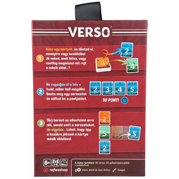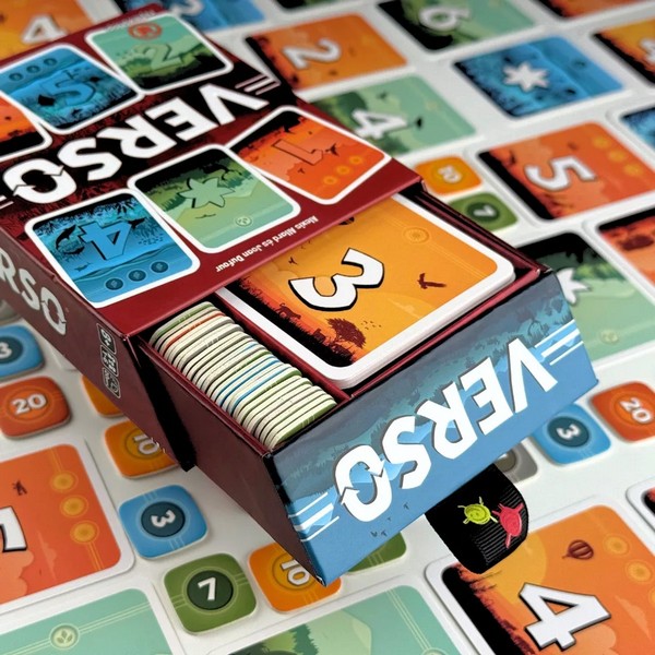 A Versóban minden játékos arra törekszik, hogy a lehető legtöbb pontot gyűjtse össze. Mindenki saját tablót épít 3 sorban, 3 különböző színben, viszont a kártyák kétoldalasak, és felhúzáskor végleg el kell dönteni, hogy melyik oldallal játsszuk ki, viszont csak következtetni tudunk, hogy mi lehet a túloldalon. A tablónkban nem lehet két azonos kártya, szóval ha nem jön be a számításunk, ki kell dobnunk a kártyát. Viszont ha lepontozunk egy sorozatot, a szomszédainkat kötelezően fel kell fordítaniuk egy kártyát. Készen állsz egy olyan játékra, ahol minden döntésednek két oldala van? A Verso egy lenyűgözően elegáns és okos kártyajáték, amelyben a látvány és a taktika kéz a kézben jár. Ebben a játékban nemcsak az számít, mi van a kezedben, hanem az is, mi rejlik a lapok hátoldalán. Vajon egy hullámzó kék tenger, egy dús zöld mező vagy a lenyugvó nap narancssárga sugara bukkan elő, ha megfordítod a kártyát? A Verso világában a stratégiai tervezés izgalma minden körben új élményt nyújt. A Verso egy nagyon könnyen tanulható társasjáték, 1 - 6 játékos részére, az átlagos játékidő rövid, csak 20 perc. A társast, a könnyebb tanulhatósága miatt, akár már 8 éves kortól ajánljuk kipróbálni. A játékmenet erősen épít a kollekció gyűjtés, a merj és nyerj és a neighbor scope mechanizmusokra.