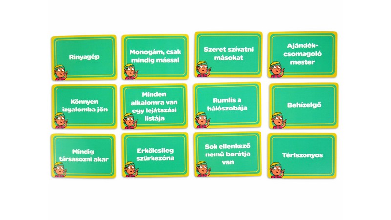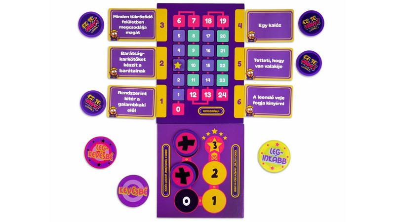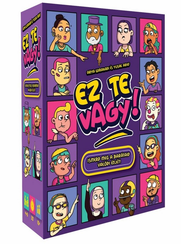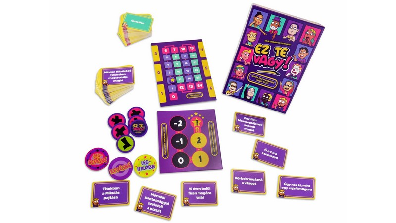 Ez te vagy – A játék, ami leleplezi, ki is vagy. Csak te tudod magadról, ki is vagy valójában –, vagy mégsem? Az Ez te vagy egy pimaszul szórakoztató partijáték, ahol a rólad és a többiekről alkotott kép válik igazi játékszerré. Kiderül, mennyire ismeritek egymást – és vajon tényleg olyan vagy-e, amilyennek látnak? Ebben a kooperatív játékban a játékosok felváltva öltik magukra a segítő szerepét azon igyekezve, hogy rávezessék a többieket az asztalon lévő jellemzők közül a kitalálandó jellemzőre azáltal, hogy kiosztják a rájuk „leginkább”, „inkább/kevésbé” vagy „legkevésbé” igaz jelölőket játékostársaik között – akár saját maguknak is adva egyet. A játékosok ezután közösen, egyesével megpróbálják kizárni a lehető legtöbb jellemzőt, vigyázva, hogy nehogy közöttük legyen a kitalálandó jellemző. Minél több ilyet zárnak ki, annál több pontot szereznek. Miután mindenki volt segítő, a pontozótábla hátoldala árulja el, mennyire ismeritek egymást. A kártyák egyszerre pimaszak és találóak: a „Venne magának egy szigetet”, a „Stresszevő”, az „Állandóan 1%-on van a telója” vagy a „Mindig késik” típusú állítások garantáltan beindítják a sztorikat. A zöld oldalon egyértelműbb, a lila oldalon kicsit elvontabb jellemzők várnak – így bármilyen társaságra ráhangolható a játék. Az Ez te vagy nem csak játék – hanem tükör is, amit a barátaid tartanak eléd. Könnyed, önironikus, és minden alkalmat feldob: családi estét, bulit, vagy egy baráti összejövetelt. Lássuk csak… ki állna le leginkább alkudozni rablókkal… Szerintem ez te vagy! Nevess, vitázz, és készülj fel: lehet, hogy a barátaid jobban ismernek, mint szeretnéd… Az Ez te vagy! egy nagyon könnyen tanulható társasjáték, 4 - 8 játékos részére, az átlagos játékidő rövidebb, csak 30 - 45 perc. A társast, a könnyebb tanulhatósága ellenére, csak 10 éves kortól ajánljuk kipróbálni. Kooperatív jellegű, a játékmenet erősen épít a szavazás és a történetmesélés mechanizmusokra.