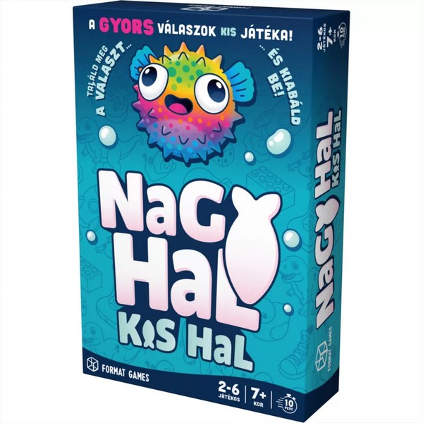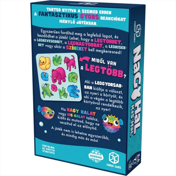 Készen állsz egy vizes kalandra? A Nagy Hal Kis Hal egy szupergyors és végtelenül szórakoztató kártyajáték, ahol a reflexeidre és a gyors döntéseidre lesz a legnagyobb szükség. A tenger alatt nem a méret a lényeg, hanem az, hogy ki csap le hamarabb a zsákmányra! Hogyan kell játszani? A szabályok pofonegyszerűek: mindenki egyszerre figyel. Amint felcsapjátok a kártyákat, keresd meg a színeket és a méreteket! Ha te vagy a leggyorsabb, és rájössz, melyik hal eszi meg a másikat, máris tiéd a pont. De vigyázz, mert a tengeri áramlatok (és a többi játékos) bármikor megzavarhatnak! Miért imádja minden család? Pörgős menetek: Nincs várakozás, mindenki egyszerre játszik, így egy pillanatra sem fogtok unatkozni. Fejleszti a figyelmet: Szuper módszer a megfigyelőképesség és a reakcióidő javítására – gyerekeknek és felnőtteknek egyaránt. Kicsi és praktikus: A doboza nem foglal sok helyet, így tökéletes útitárs nyaraláshoz, vonatozáshoz vagy a nagyihoz. Mindenkinek szól: Már 6 éves kortól simán játszható, de a felnőtteknek is komoly kihívást jelent, ha beindul a tempó. Játékosok száma: 2–5 fő. Játékidő: kb. 10-15 perc (ideális egy gyors menetre). Ajánlott életkor: 6 éves kortól. A csomag tartalma: Pakli színes halkártya és a könnyen érthető játékszabály. Csobbanj bele a mókába, és mutasd meg, hogy te vagy a tenger leggyorsabb vadásza!