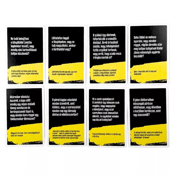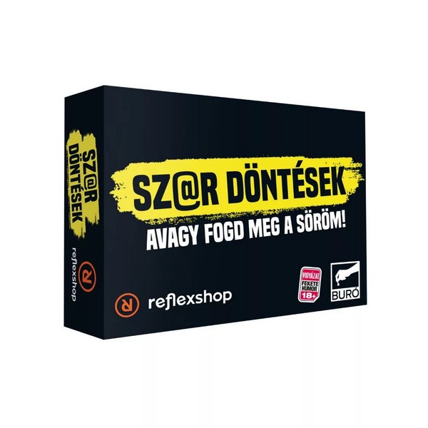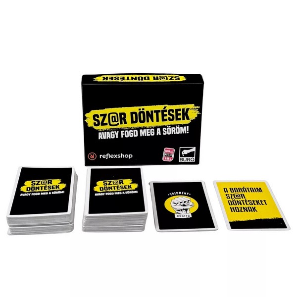 Úgy gondolod, jól ismered a barátaidat? Fogd meg a söröm! Húzz egy kártyát, olvasd fel a kérdést, és figyeld, ahogy mindenki próbálja palástolni a pánikot. Szavazzatok. Aztán jön az a csend, amikor lassan összeáll a kép, és rájössz: ezek az emberek tényleg ilyenek. Vitatkoztok? Valószínű. Meglepődsz? Igen. Szétesik a barátságotok? Talán. De hé – ti választottátok egymást! Néha egy rossz döntés az egész este legjobb része — vágjatok bátran bele! A Sz@r döntések egy őszintén pimasz partijáték, ahol két borzasztó opció között kell választanod — és nincs „passz”. A kérdések meredekek, a döntések vállalhatatlanok, a reakciók pedig garantáltan elszabadítják a nevetést. Minden körben valaki feltesz egy új dilemmát, a játékosok pedig egyszerre mutatják fel, melyik rossz megoldásra voksolnak. A kérdező titokban megtippeli, mit választ majd a többség — ha bejön, pontot szerez, és közelebb kerül a győzelemhez. A körök gyorsak, egyszerűek, és kiderül, mennyire ismeritek egymást… vagy mennyire NEM. A döntések mögött nem csak opciók vannak: viták, röhögések, döbbenetek és olyan pillanatok, amelyeket később is emlegetni fogtok. A játék akár pontozás nélkül, akár piálós verziókban is játszható — a hangulat pedig minden esetben felszabadult, hangos és totálisan szórakoztató. A Sz@r döntések tökéletes választás baráti estékhez, bulikhoz, vagy bemelegítő játéknak, amikor már az első körben letépitek a szociális szűrőt. Vágjatok bele, és derüljön ki: tényleg olyan jók vagytok a rossz döntésekben, mint hiszitek? A Sz@r döntések egy nagyon könnyen tanulható társasjáték, 5 - 30 játékos részére, az átlagos játékidő rövidebb, csak 20 - 40 perc. A társast felnőtteknek ajánljuk!