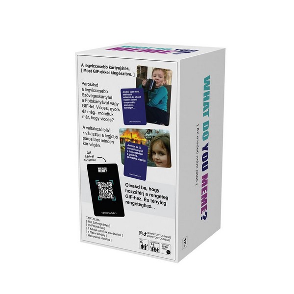 A Wdym What Do You Meme Gif Edition kártyákkal, izgalmas és hihetetlenül vicces szövegekkel, biztosan azonnal a kedvencetekké fog válni. A játékszabály röviden: A játék megkezdéséhez mindegyik játékos húz 7 szövegkártyát. A legtöbb Instagram követővel rendelkező játékos lesz a bíró az első körben. A bíró szétnéz a fotókártyák között, és kiválasztja azt, amelyiket el akarja bírálni az adott körben. Megmutatja mindenkinek, majd ráteszi az előtte lévő festőállványra. Mindenkinek van pár perce eldönteni, hogy a 7 szövegkártyája közül melyik illik a legviccesebben a játékban lévő fotókártyához, majd lefordítva odaadja a bírónak. A bíró dönt, hogy az adott képhez melyik a legviccesebb szöveg, és nyertes megtarthatja a fotót. Tartalmaz: 450 szövegkártyát, 75 fénykép kártyát, 1 kártya a GIF-ek eléréséhez, 1 szexi állvány, 1 használati utasítás.