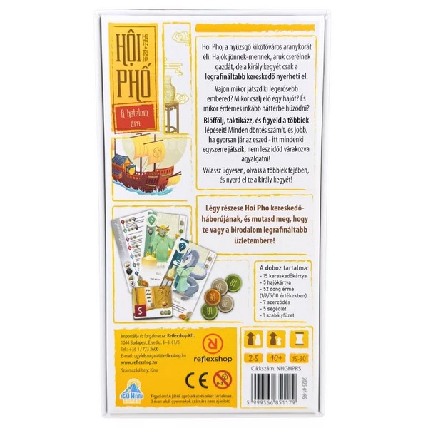 Hoi Pho, a nyüzsgő kikötőváros aranykorát éli. Hajók jönnek-mennek, áruk cserélnek gazdát, de a király kegyét csak a legrafináltabb kereskedő nyerheti el. Vajon mikor játszd ki legerősebb embered? Mikor csalj elő egy hajót? És mikor érdemes inkább háttérbe húzódni? Blöffölj, taktikázz és figyeld a többiek lépéseit. Minden döntés számít, és jobb ha gyorsan jár az eszed - itt mindenki egyszerre játszik, nem lesz időd várakozva agyalgatni! Válassz ügyesen, olvass a többiek fejében és nyerd el te a király kegyét! Képzeld el magad egy vibráló vietnámi éjszakai piacon, ahol a levegőben gőzölgő Pho leves, fűszeres húsok és egzotikus kávék illata száll. A Hoi Pho egy rendkívül hangulatos és pörgős kártyajáték, ahol a legdörzsöltebb kereskedővé kell válnod. Ebben a játékban minden kártya egy újabb ravasz üzleti fogás – a kérdés csak az, tudsz-e élni a lehetőséggel? A Hoi Pho egy nagyon könnyen tanulható társasjáték, 3 - 5 játékos részére, az átlagos játékidő rövid, csak 15 - 30 perc. A társast, a könnyebb tanulhatósága ellenére, csak 10 éves kortól ajánljuk kipróbálni. A játékmenet erősen épít az ütés-váltós, az egyidejű akciók, a pakli tervezés és a selection order bid mechanizmusokra.