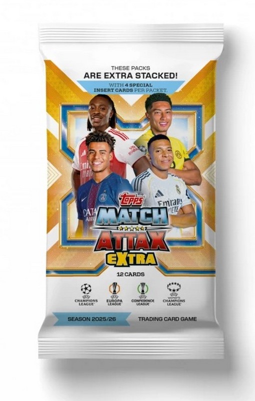 Készülj fel a futballszezon legizgalmasabb frissítésére! A Topps Match Attax Extra 2025/26 kollekció elhozza a legfrissebb átigazolásokat, az UEFA klubversenyeinek (Bajnokok Ligája, Európa Liga, Konferenciája Liga) legnagyobb sztárjait és az új szezon legforróbb kártyatípusait. Ez a csomag tökéletes választás gyűjtőknek és a stratégiai kártyajáték kedvelőinek egyaránt. A csomag tartalma: 12 darab hivatalos kártya minden tasakban. Garantáltan 4 speciális "Insert" kártya csomagonként.